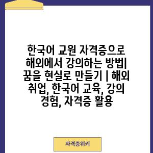 한국어 교원 자격증으로 해외에서 강의하는 방법 | 꿈을 현실로 만들기 | 해외 취업, 한국어 교육, 강의 경험, 자격증 활용 한국어 교원 자격증을 취득하고 해외에서 한국어를 가르치는 꿈을 꾸고 계신가요? 열정과 전문성을 갖춘 당신의 꿈을 현실로 만들 수 있는 방법을 알려드립니다. 해외 취업은 멀게만 느껴지지만, 체계적인 준비와 전략으로 충분히 도전할 수 있습니다. 한국어 교원 자격증은 해외에서 … Read more